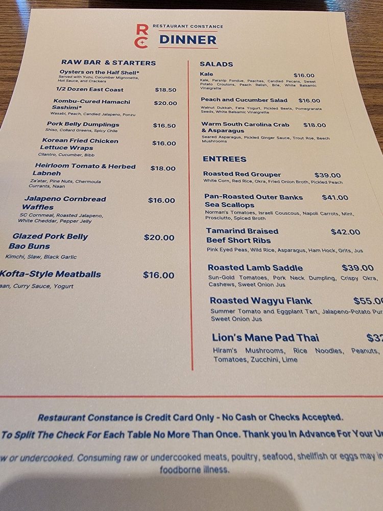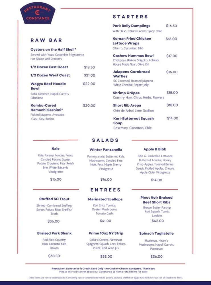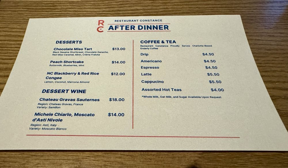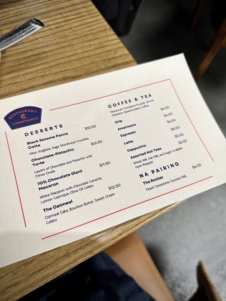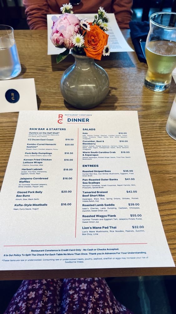 Restaurant Constance, located in Charlotte, NC, offers a unique dining experience with a constantly changing menu based on seasonal ingredients from Carolina-based farms. The intimate setting with only 10 tables creates a cozy atmosphere, perfect for special occasions. The NA Cocktail Flight allows for a variety of cocktail tastings, while standout dishes like the Korean Fried Chicken lettuce wraps and jalapeno cornbread waffle showcase innovative flavors. The Outer Banks scallops and chocolate miso tart provide a satisfying finish to a memorable meal. With rave reviews praising the exceptional service, extensive wine selection, and delectable dishes such as hamachi, beef short ribs, and wagyu steak, Restaurant Constance promises a culinary experience worth returning for. Make a reservation to indulge in a remarkable fusion of textures and flavors at this must-visit New American hotspot.